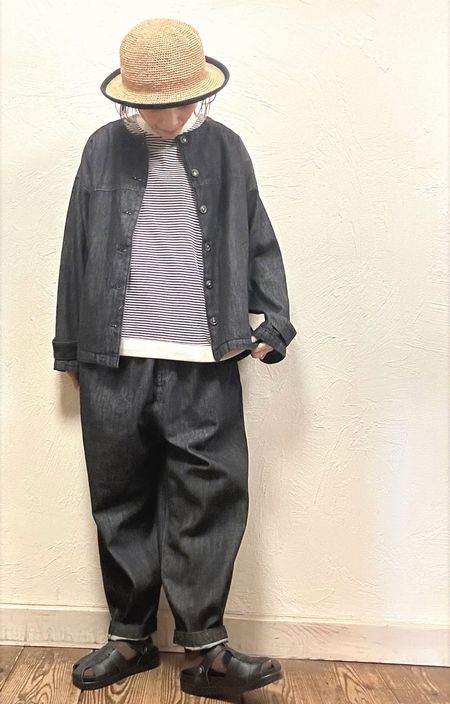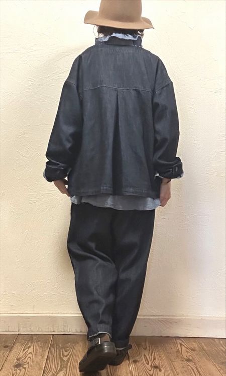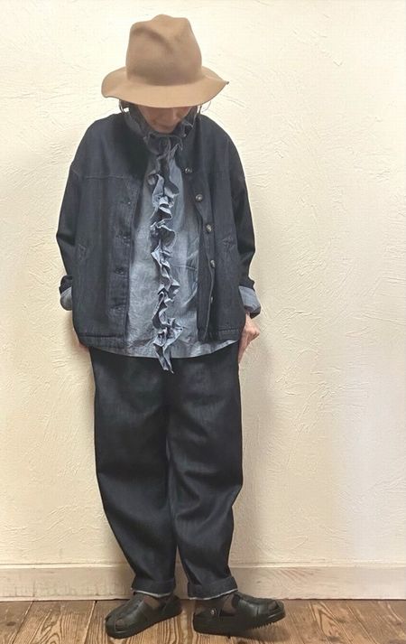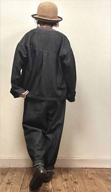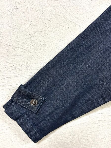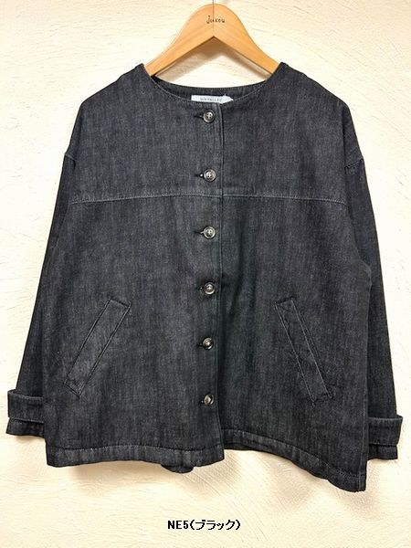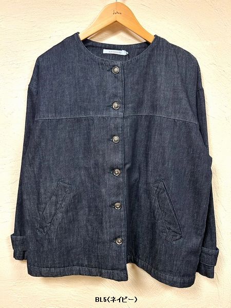 柔らかでほどよい厚みのあるコットン甘織デニムノーカラージャケットです