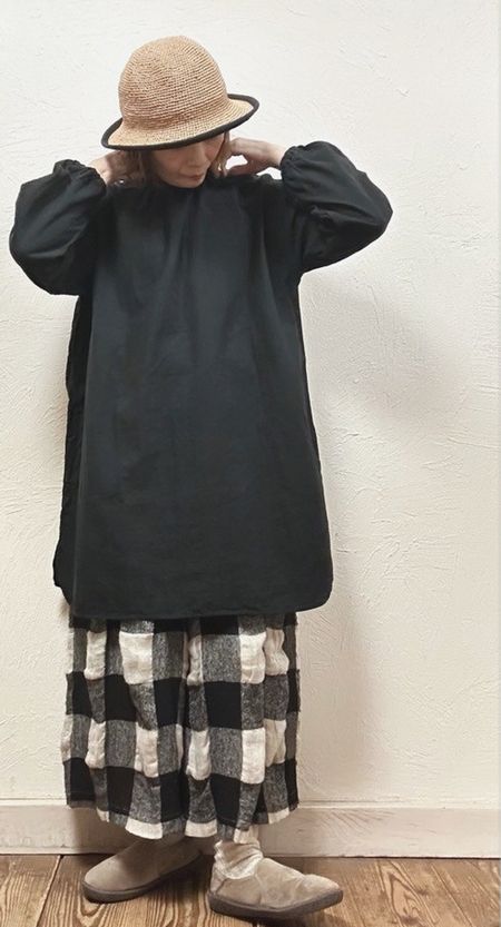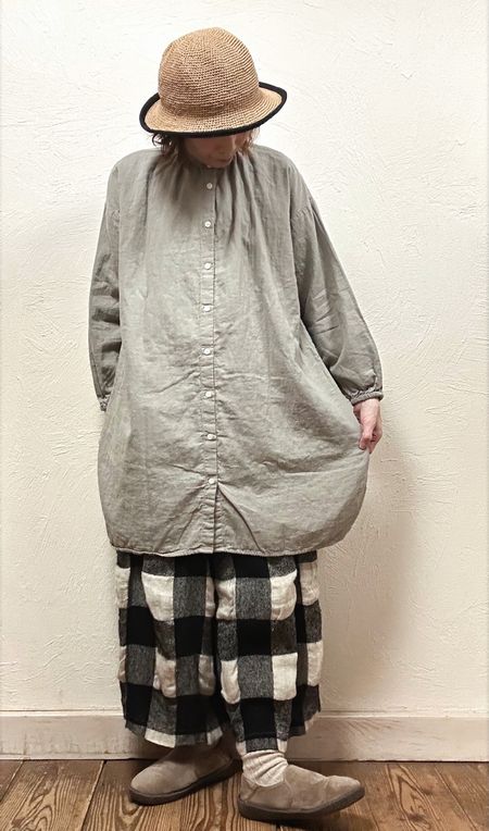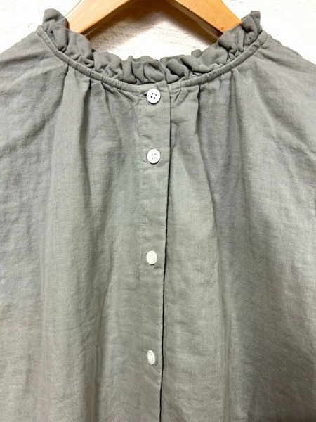 ドロップショルダーとゆとりある身幅で着心地よく、衿ぐりからはギャザーが入り裾に向かってふんわり広がるシルエットになっています
